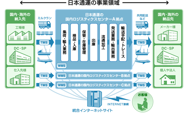例えば、情報システム(受発注業務、入出庫・在庫管理、輸配送業務における貨物トレース等)や、流通加工機能(検品、値札付け、梱包、セット組、店舗別配送仕分け等)の活用や、輸送モードを高度に組み合わせる「物流最適化のコントロールセンター」として機能すると共に、一方では、ファイナンス面でもお客様をサポートし、従来の物流業務の領域を越えた、新たなサービスを展開してまいります。