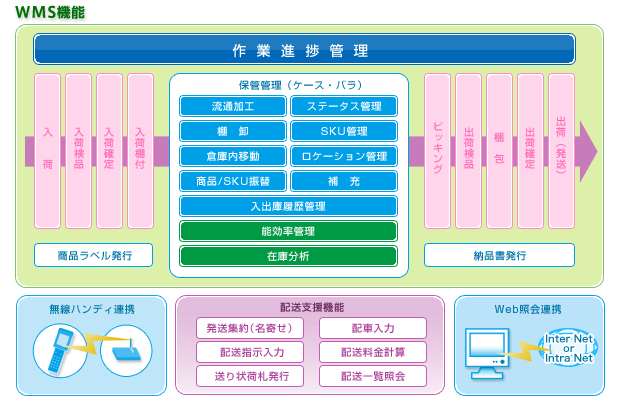 SKU管理やロケーション管理といったWMS(倉庫管理システム)としての基本機能はもちろん、各種送状・荷札印刷、配車入力といったTMS(配送管理システム)機能も包括。お客様の業務に応じて必要な機能をカスタマイズすることが可能なシステムです。