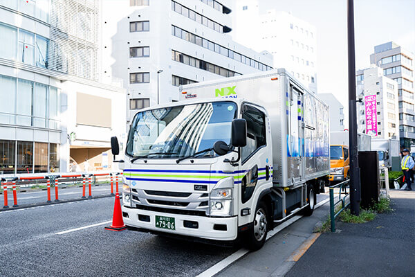 新オフィスは敷地内にトラックを停車できず、公道に停車しての作業が必要だった。NXでは事前に所轄の警察署に申請して道路使用許可証を取得。さらに、停車する公道が交通量の多い「主要道路」だったため、交通誘導警備業務2級資格保有の警備員を配置した。