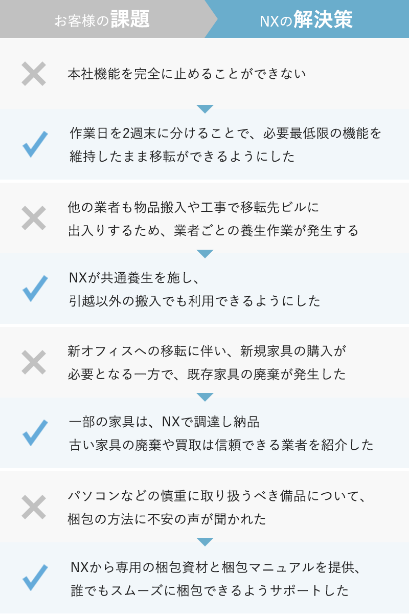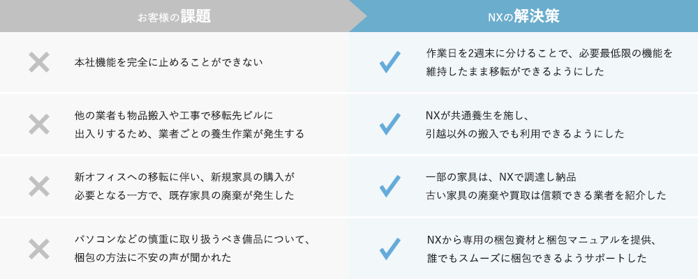 準備を進める中で、主に以下のような課題が浮き彫りになってきました。NXでは課題を十分に検討したうえで、解決策を提示し、安心して移転当日をお迎えいただけるよう万全の体制を整えました。