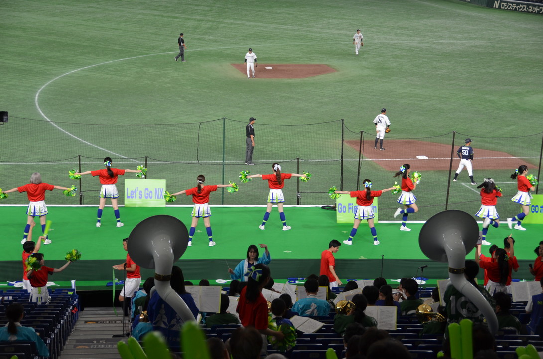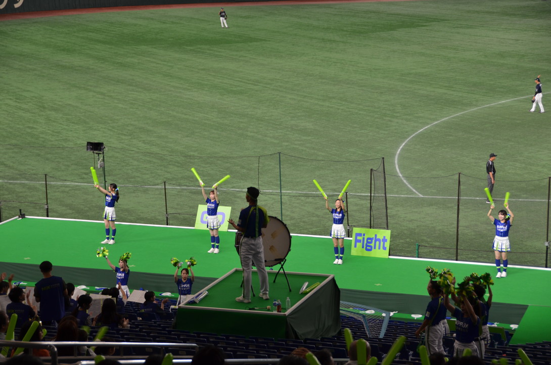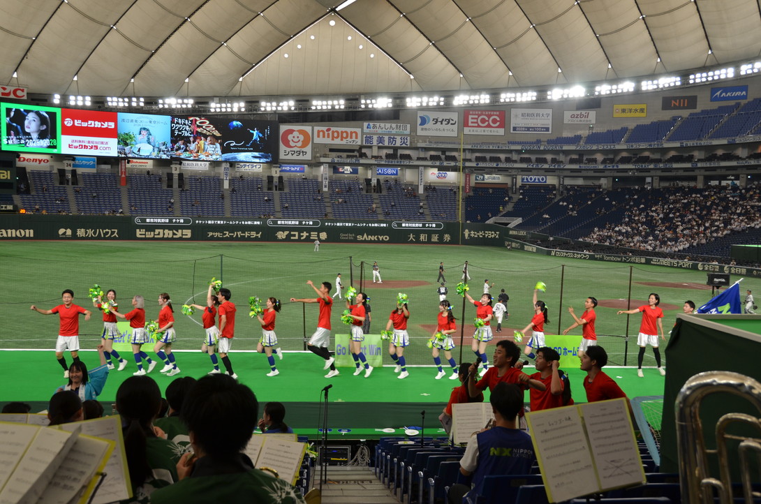 当社応援団33名と明治大学の応援団・吹奏楽団総勢約70名と約5000名の観客が新曲2曲を加えて応援、フィールド内でプレーする選手達に力を届けた。