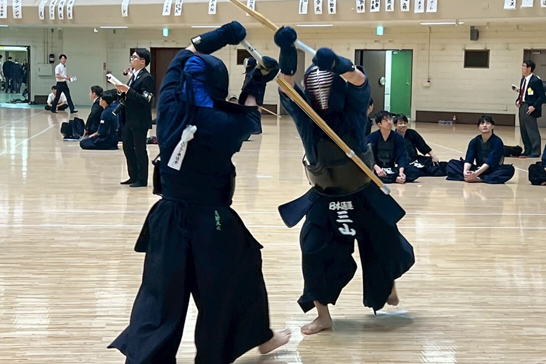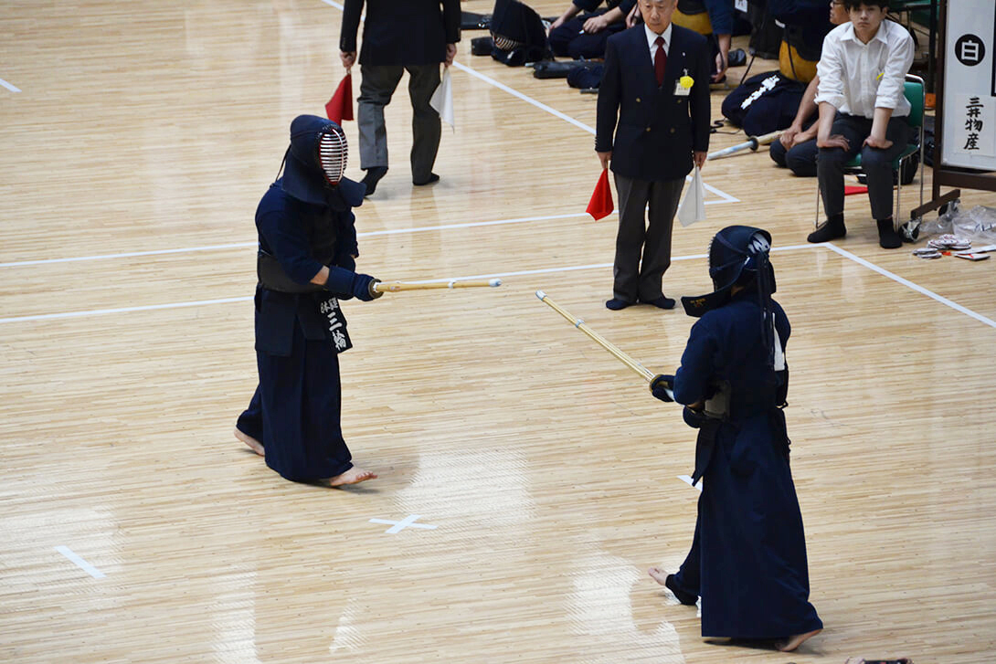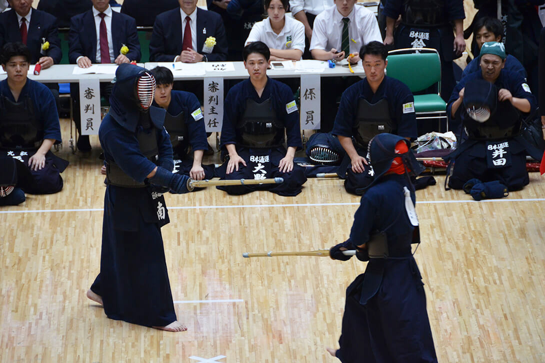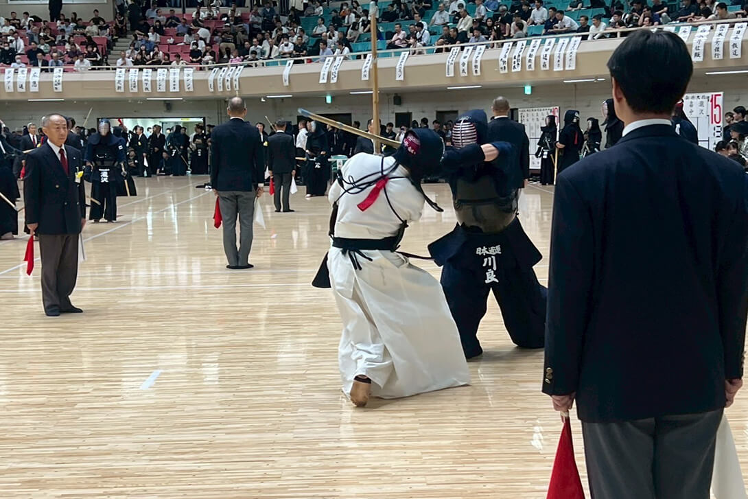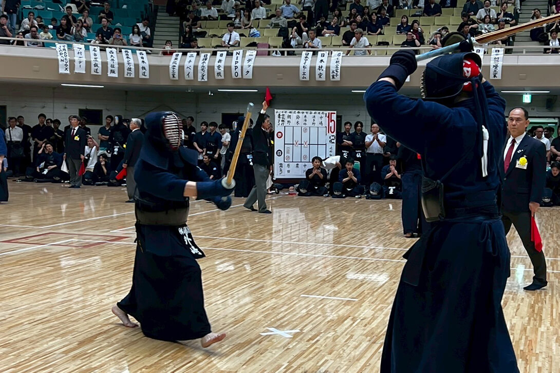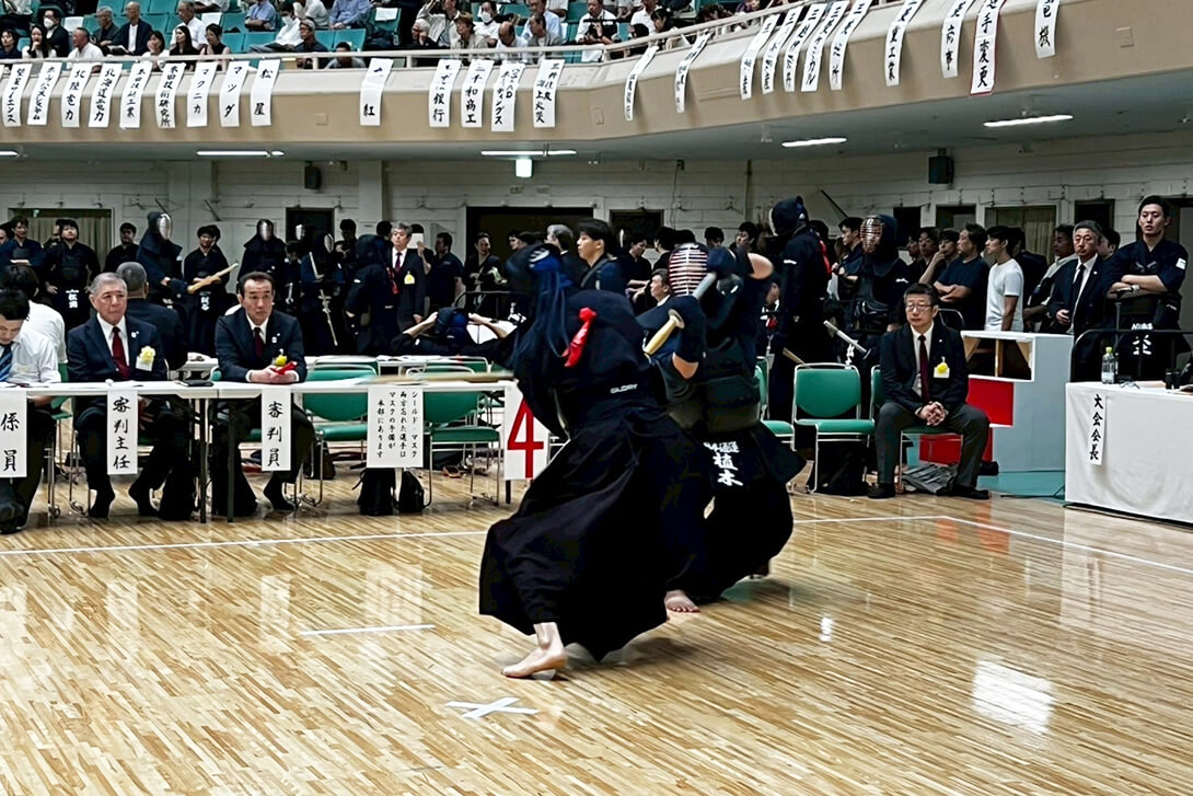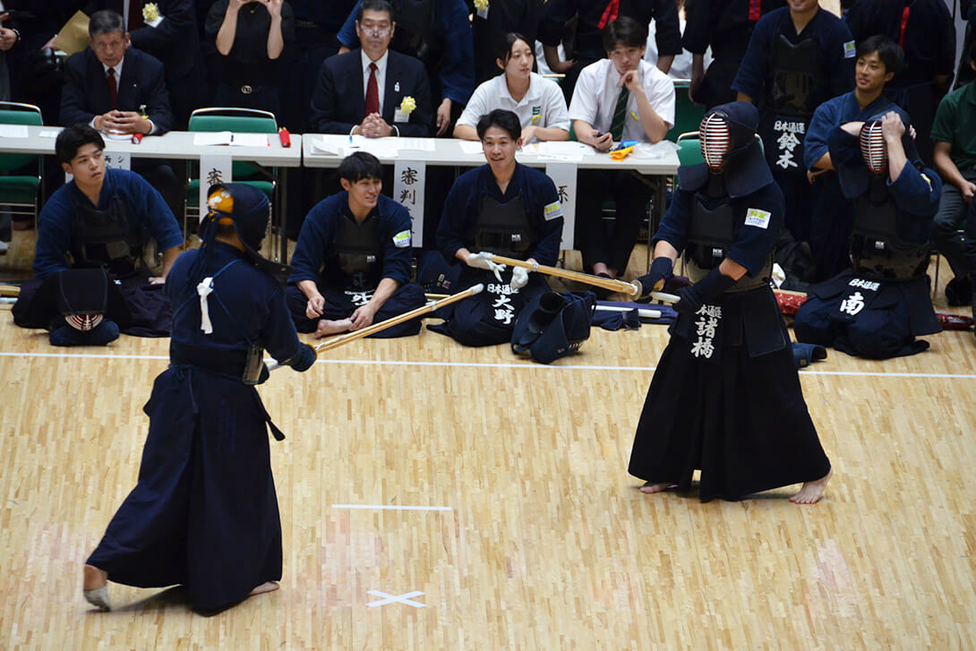 初戦となる2回戦の相手は丸紅。序盤、先鋒・外崎が鮮やかなメンを決め、チームに勢いをもたらした。次鋒・大野は互角の攻防の末、引き分けに持ち込み、続く中堅・諸橋はコテを先取して優位に立ったものの、終了間際にドウを奪われて引き分けに。