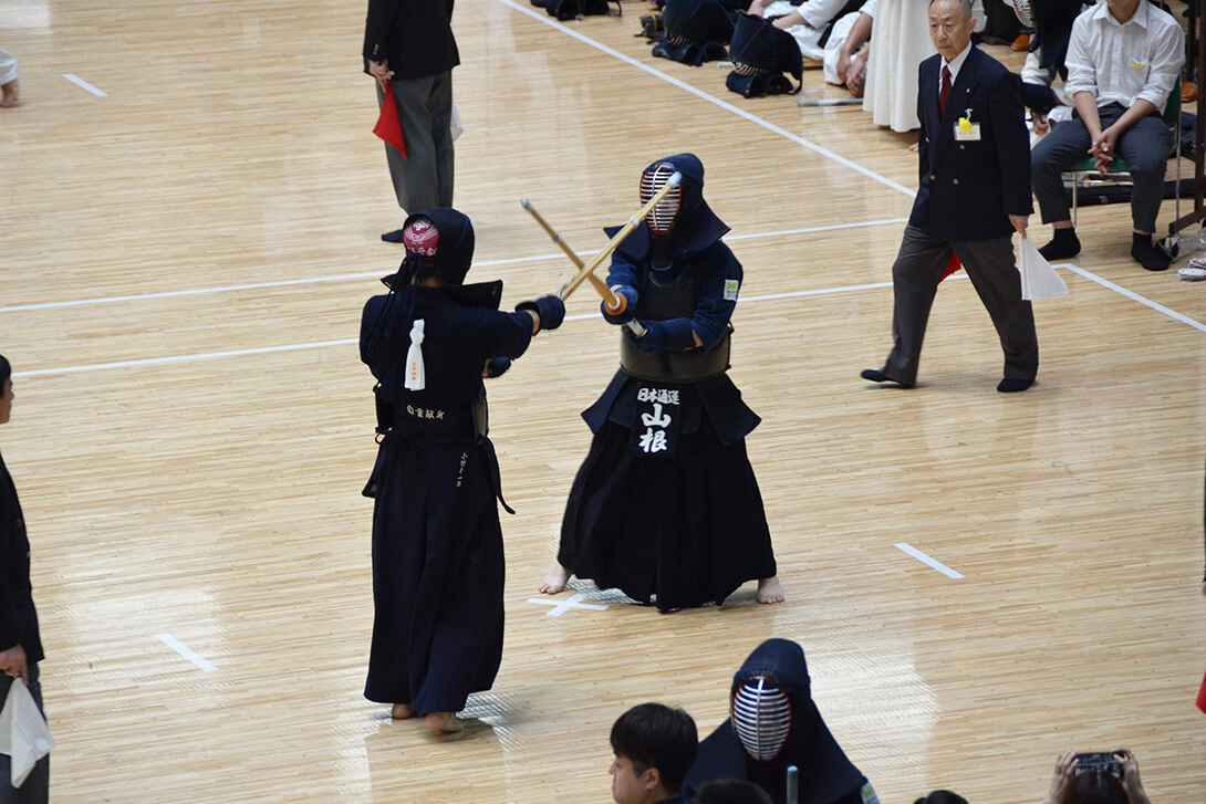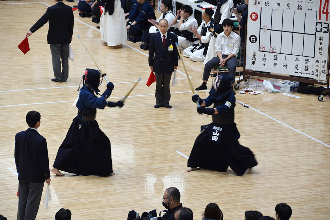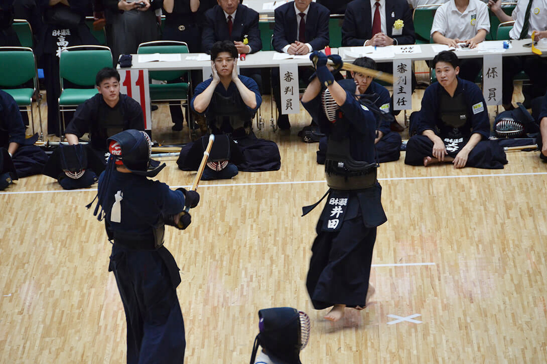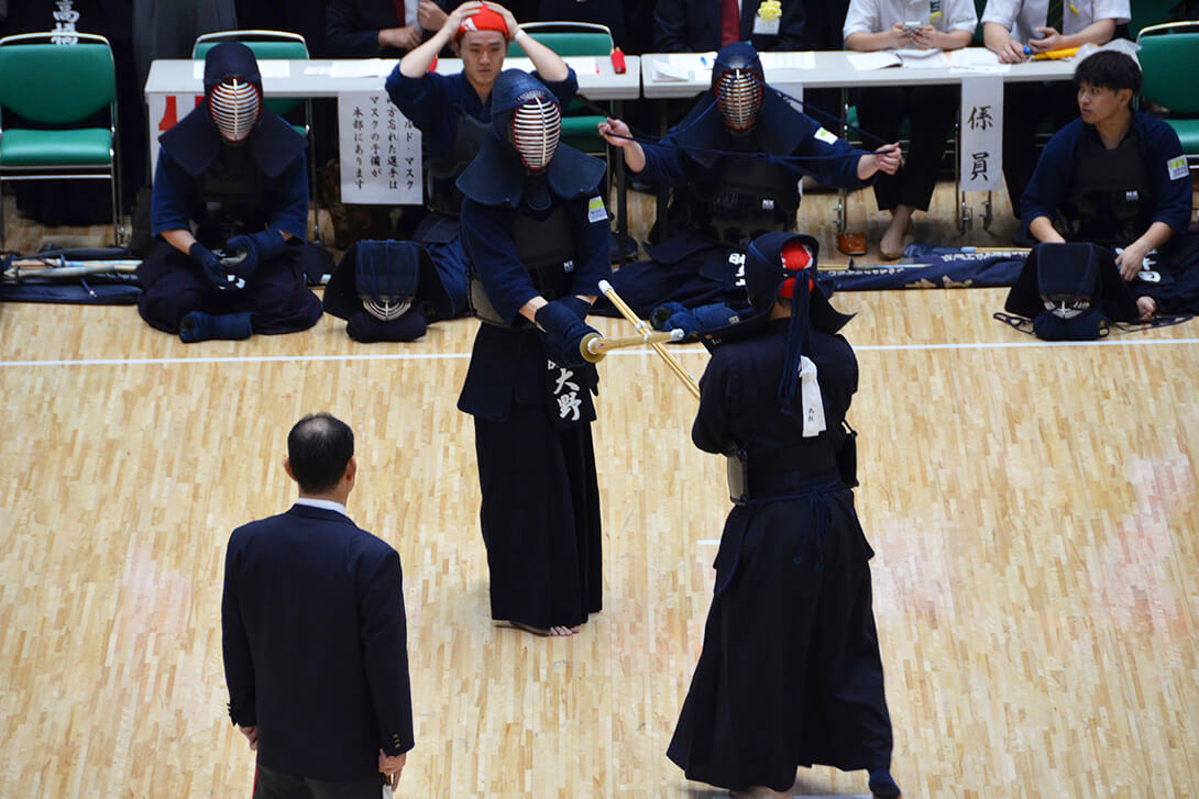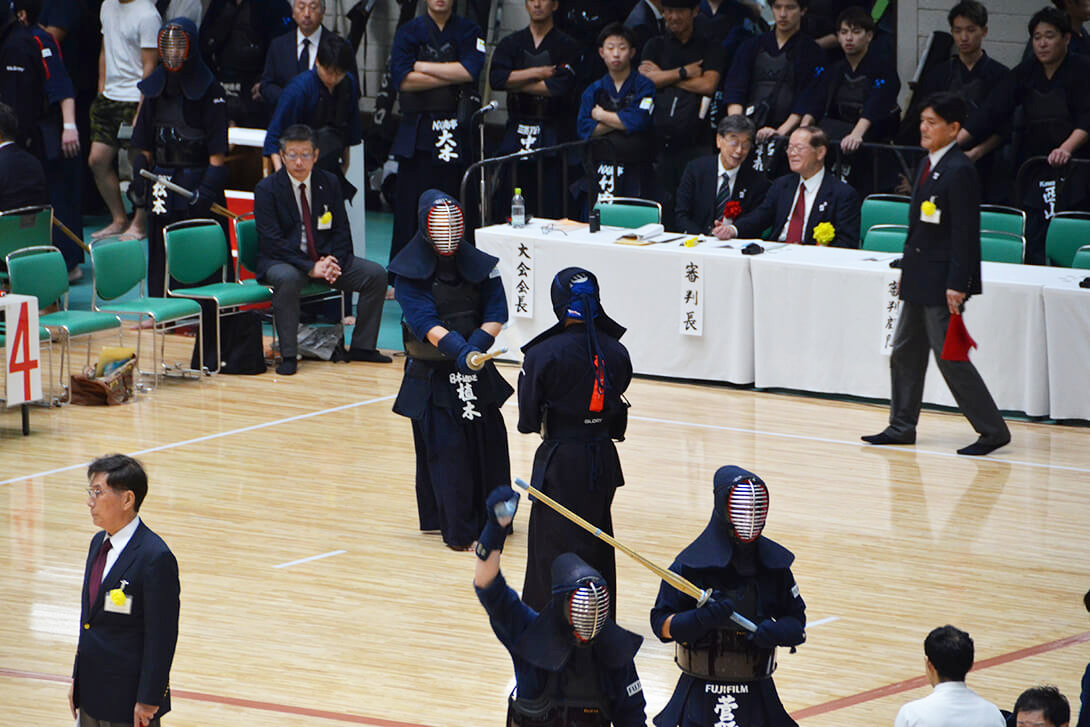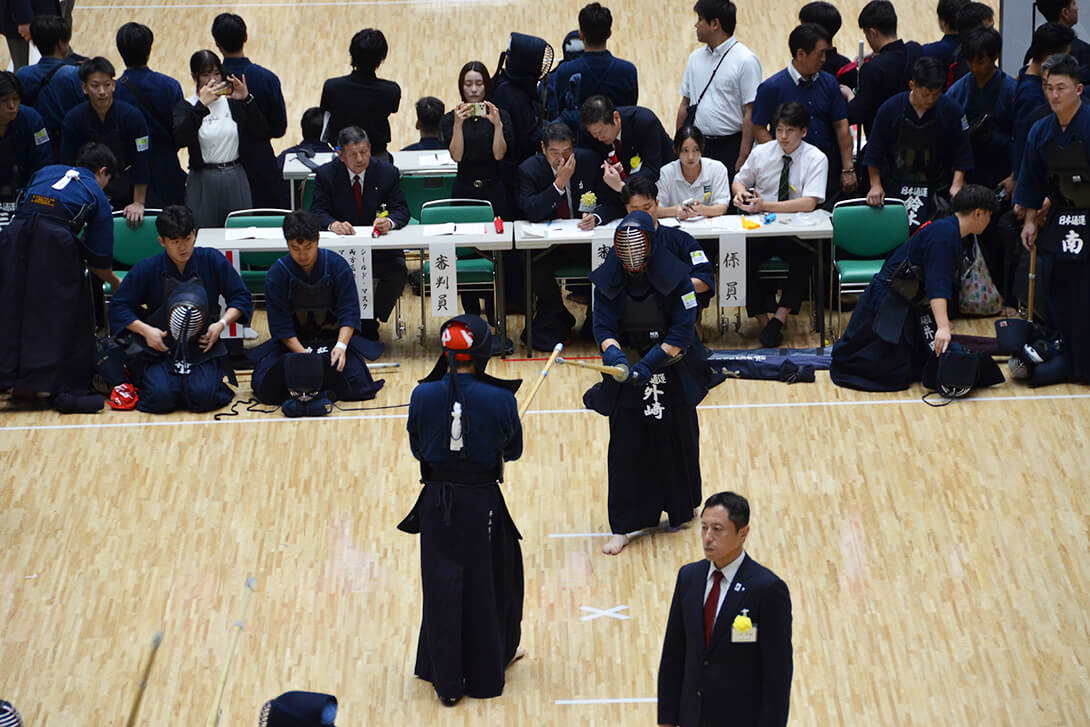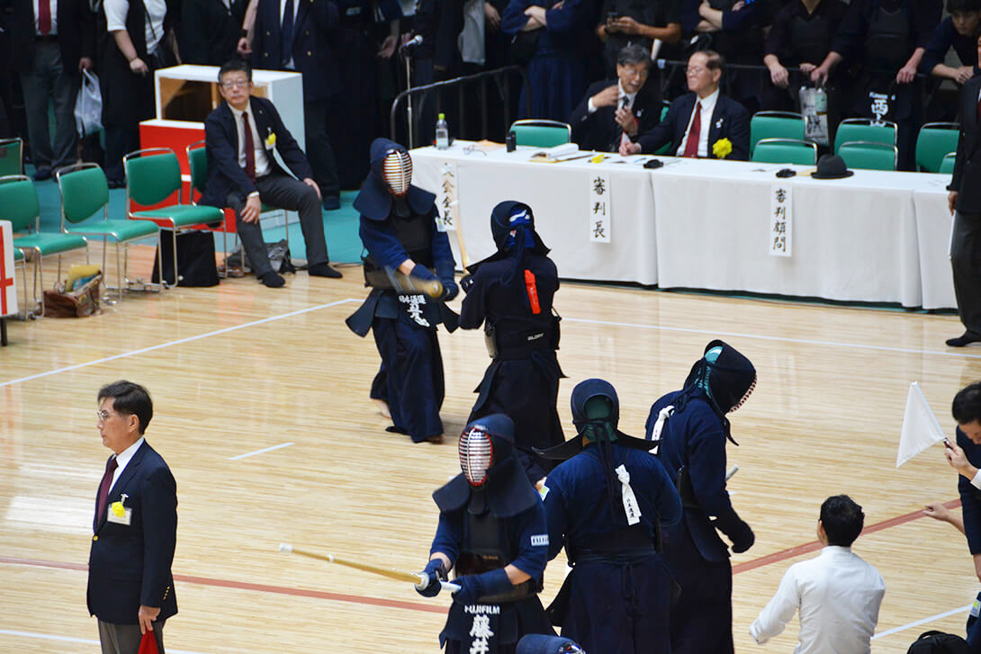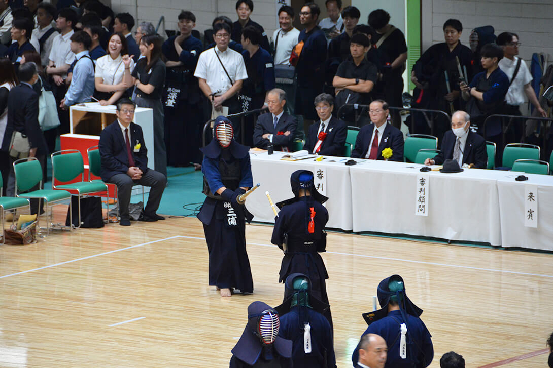 先鋒・次鋒が一本負けを喫し苦しい立ち上がりとなったが、中堅・川良がドウで一本勝ちを収めると、副将・三輪も終了間際にメンを決めて追いつく。大将・三山は攻め続けたが引き分けに終わり、勝負は代表戦へ。